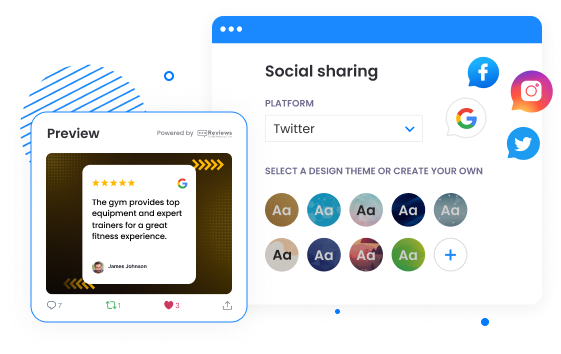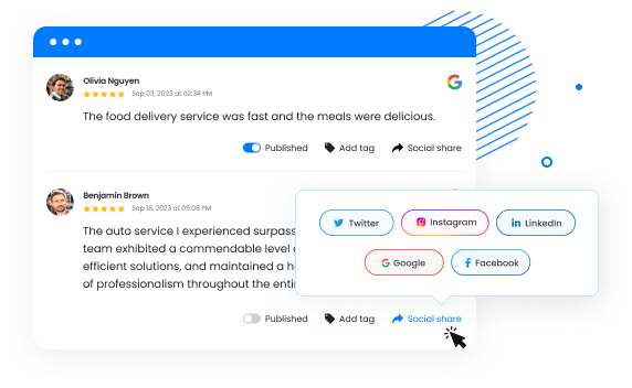 Drive more traffic and sales with social media posts created from your best online reviews. Instantly take your social media marketing to the next level with our customizable social sharing tool.